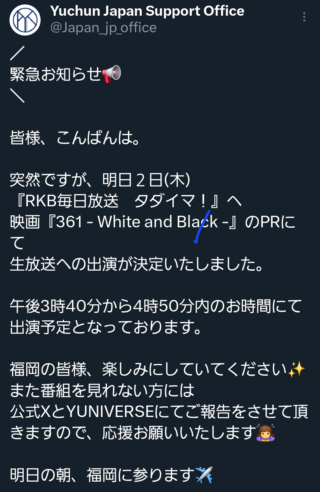 ユチョンが福岡の生放送番組に出演〜