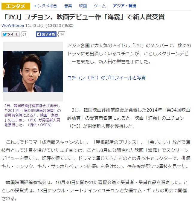 ゆちょん。。。大阪 京セラドームの公演終わってから、感想書く暇もなく 次から次へとニュースが!!! 17日 第35回青龍映画祭授賞式 19日 韓国映画俳優協会授賞式(今日追加されてました) 2… 続きを読む »