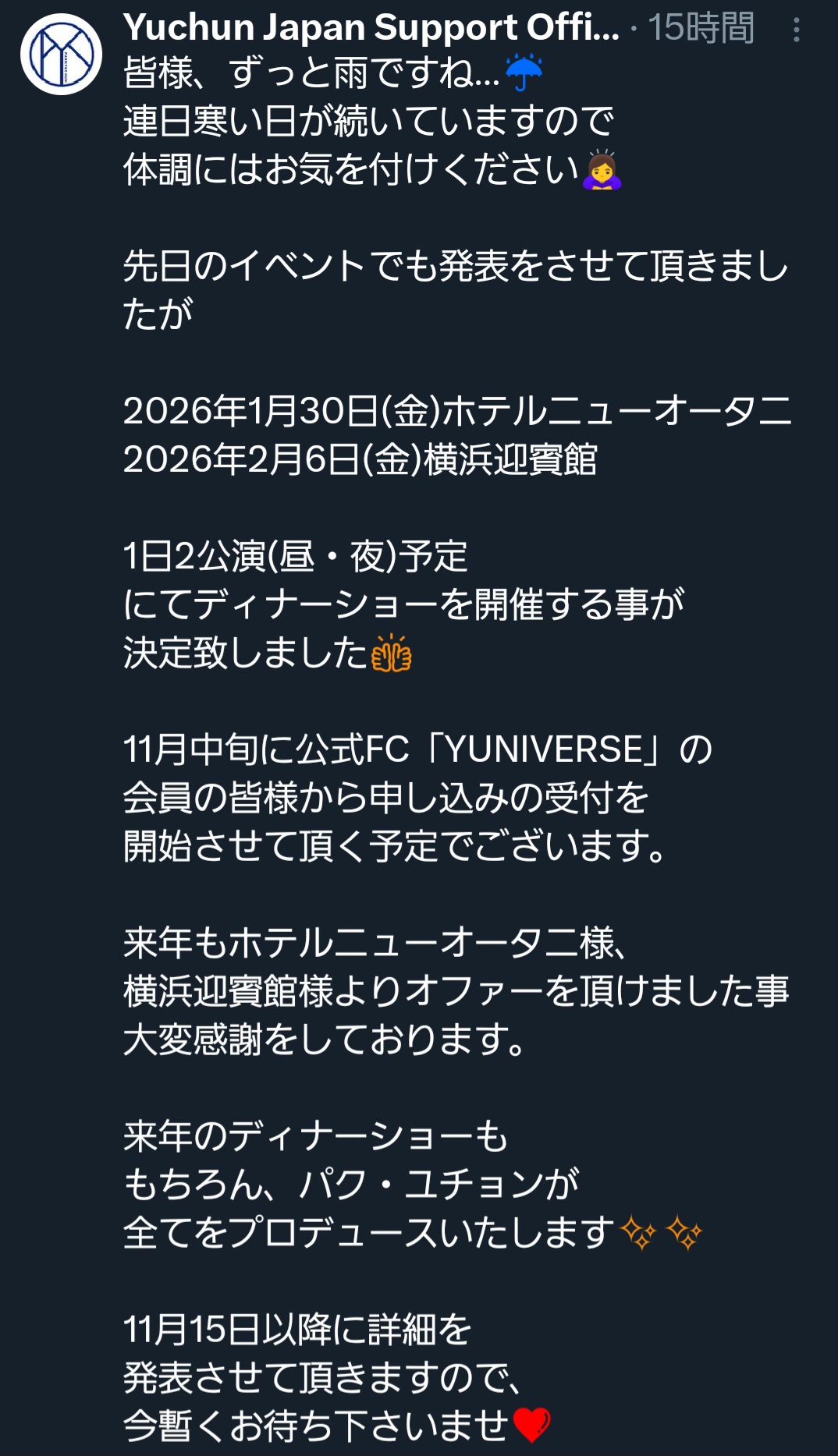 昨日はユチョンの来年のディナーショー